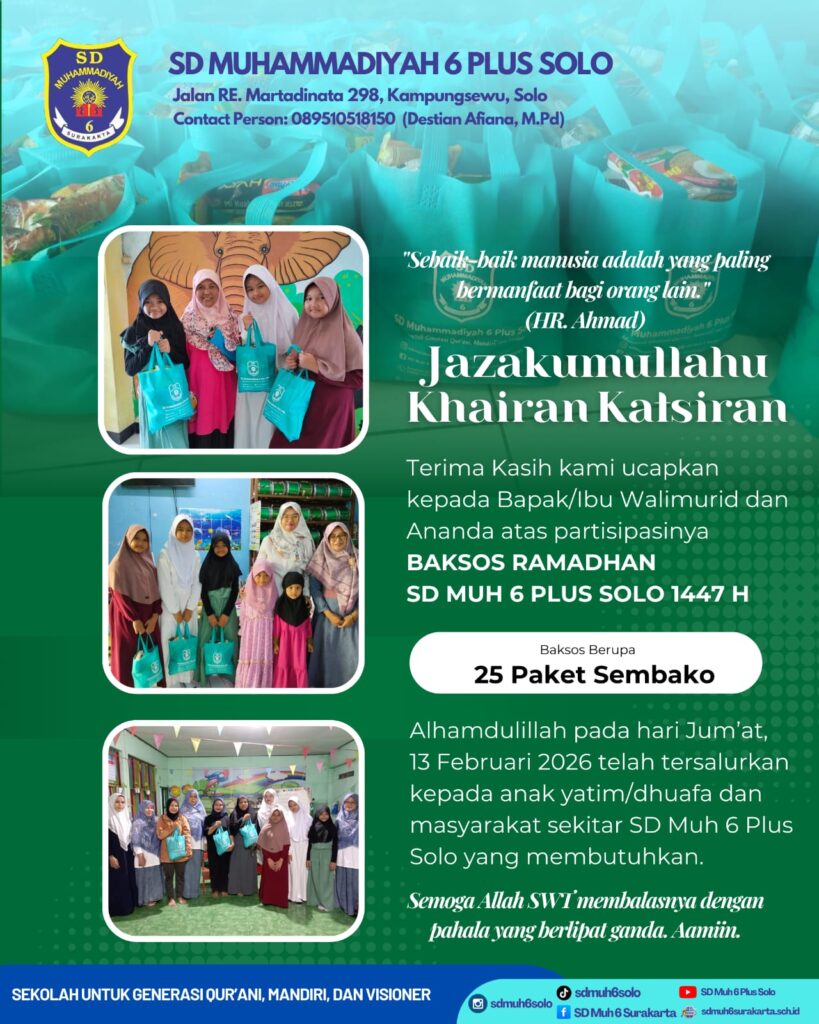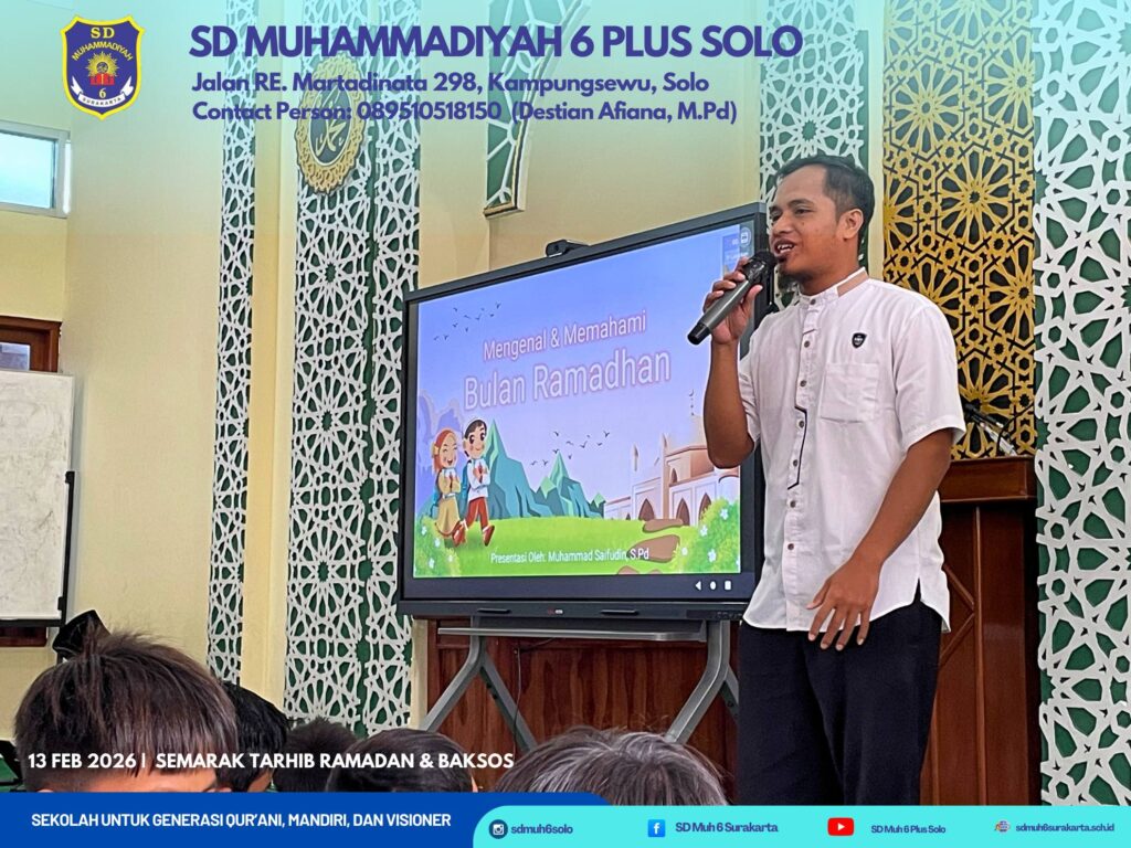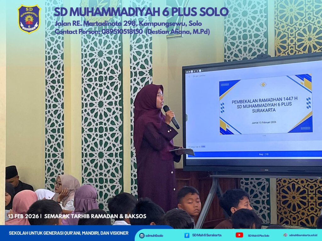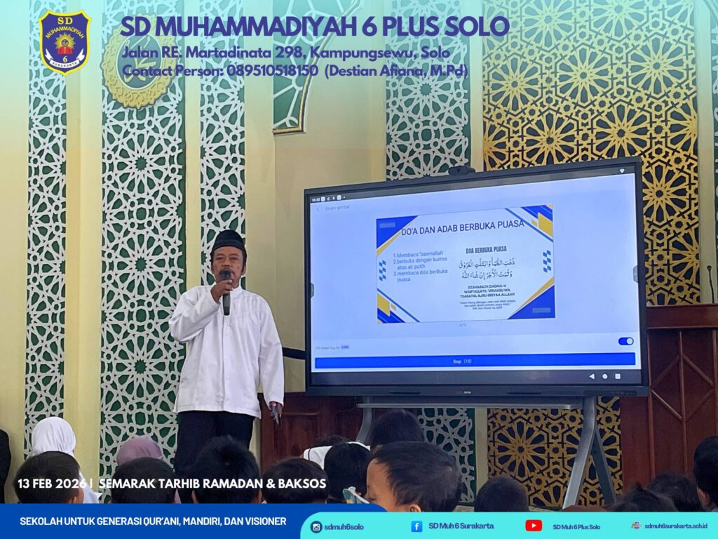 Kampungsewu – Jumat pagi tanggal 13 Februari 2026 bertepatan 25 Syakban 1447H, agenda positif dalam rangka menyambut bulan puasa pada pekan depan SD Muhammadiyah 6 Plus Surakarta menyelenggarakan Tarhib Ramadan dan Bakti Sosial 1447H.